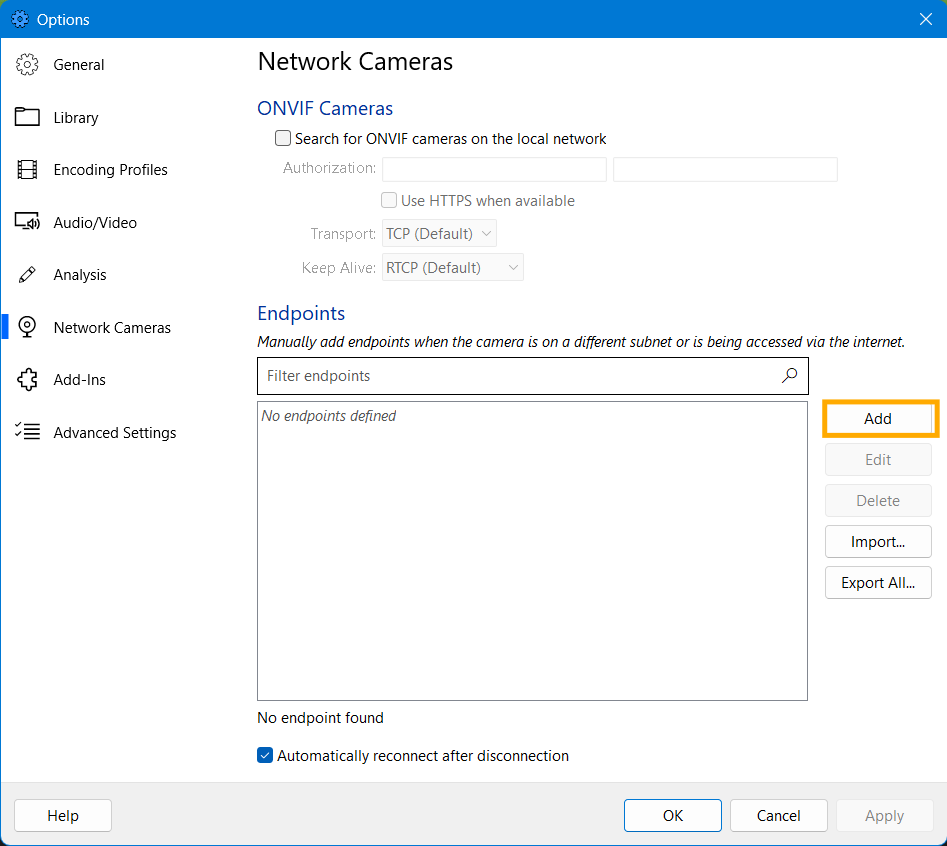 Open Tools > Options, open the Network Camera panel, click Add